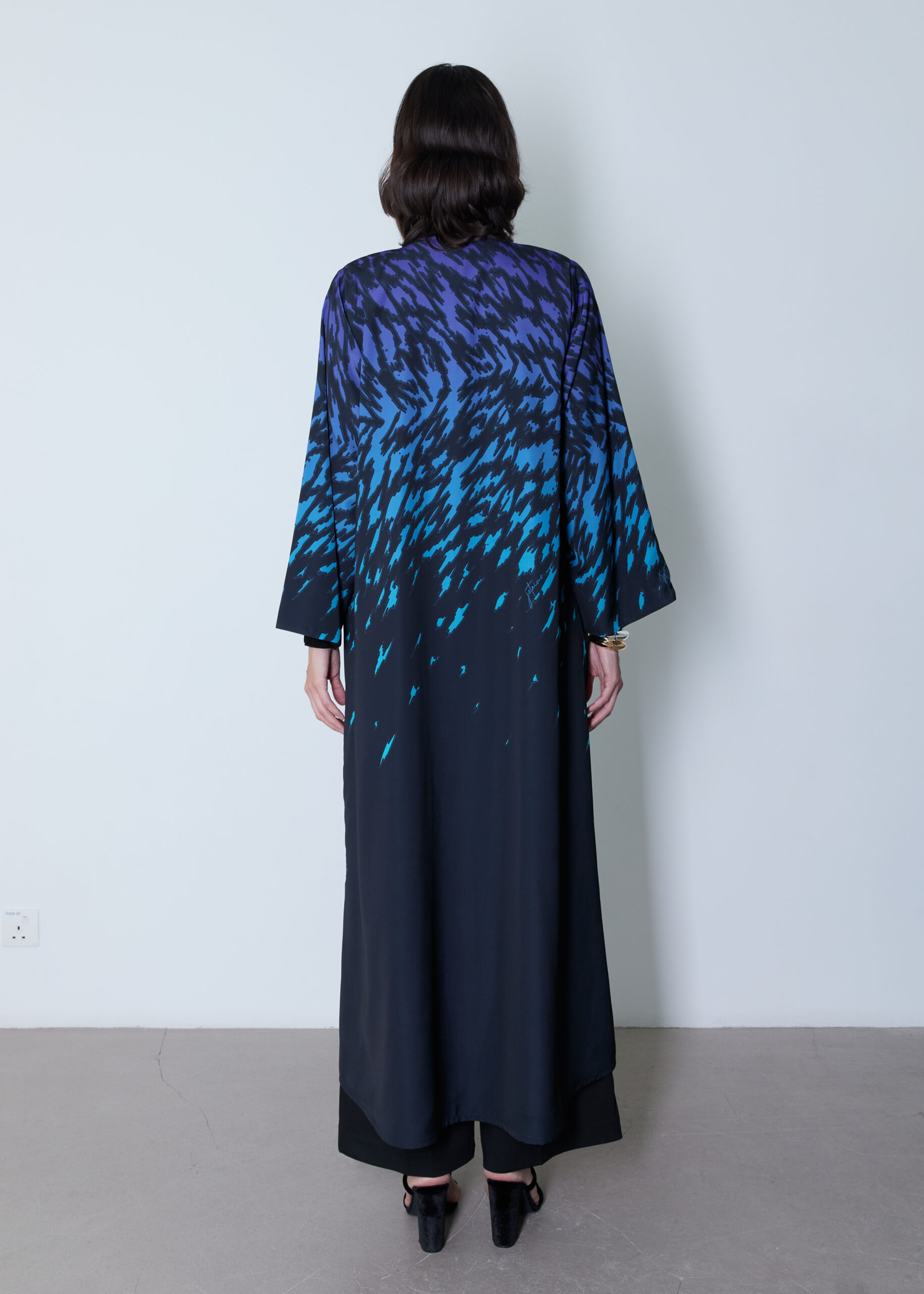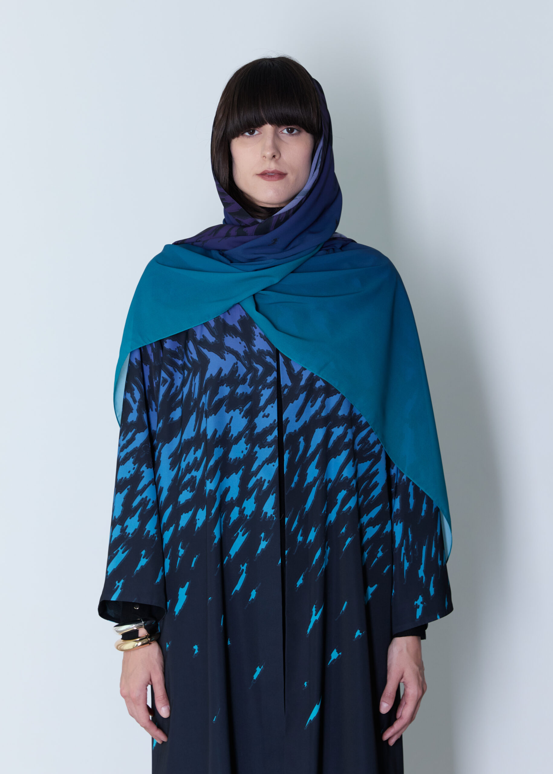 *A modern abaya featuring a distinctive artistic print exclusive to our brand, blending elegant blue , green , & purple tones for a striking visual depth. Crafted from crepe soft fabric, it offers comfort and effortless wear with a feminine, relaxed silhouette. Paired with a matching sheila made from doja al lail fabric ” A statement piece that combines contemporary elegance with practical sophistication—perfect for refined everyday styling.