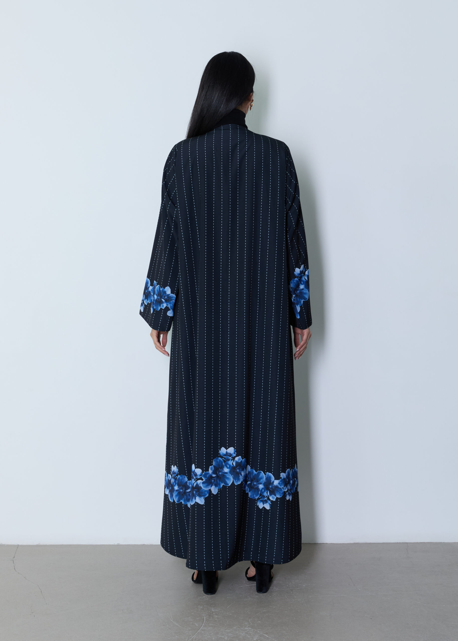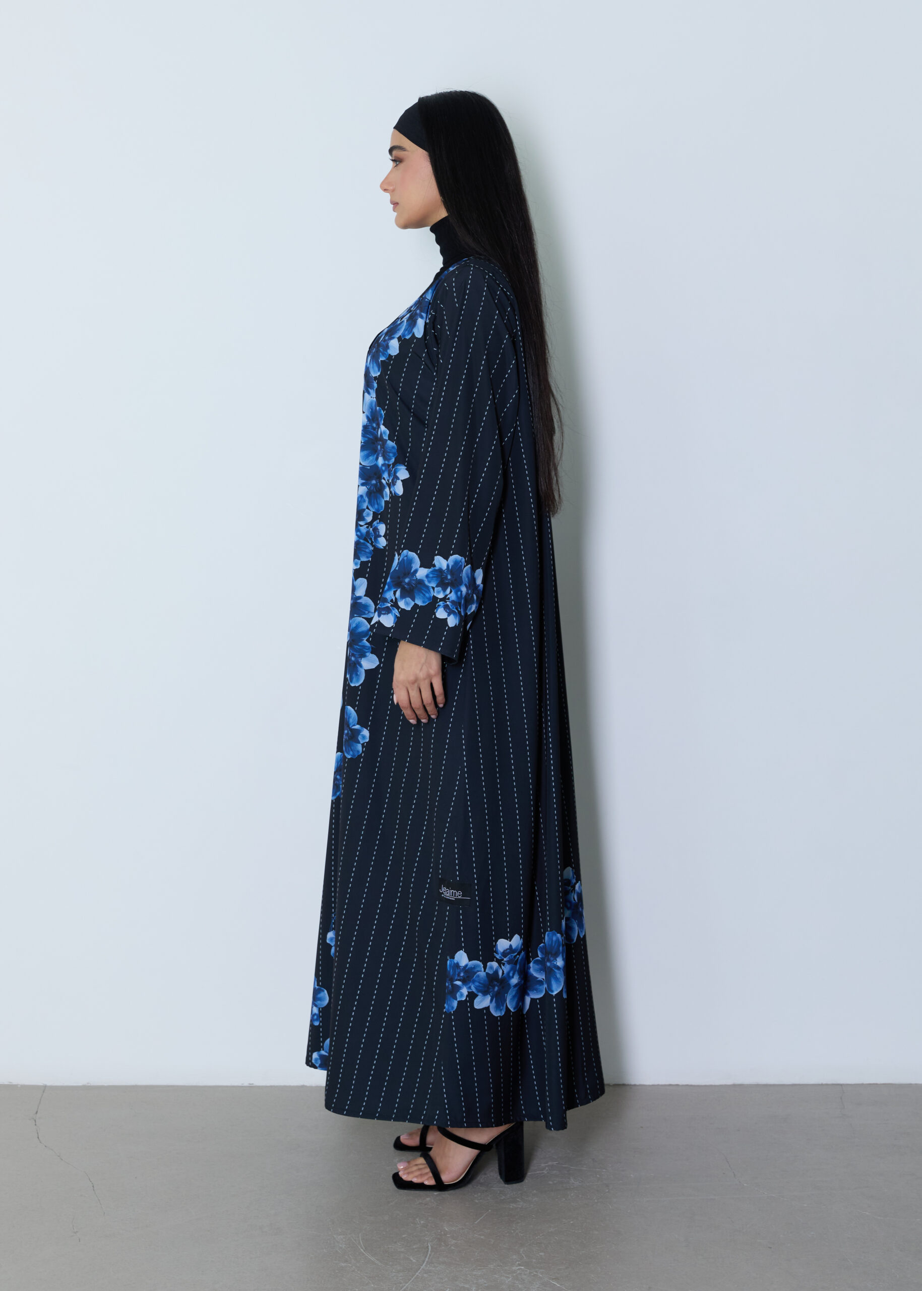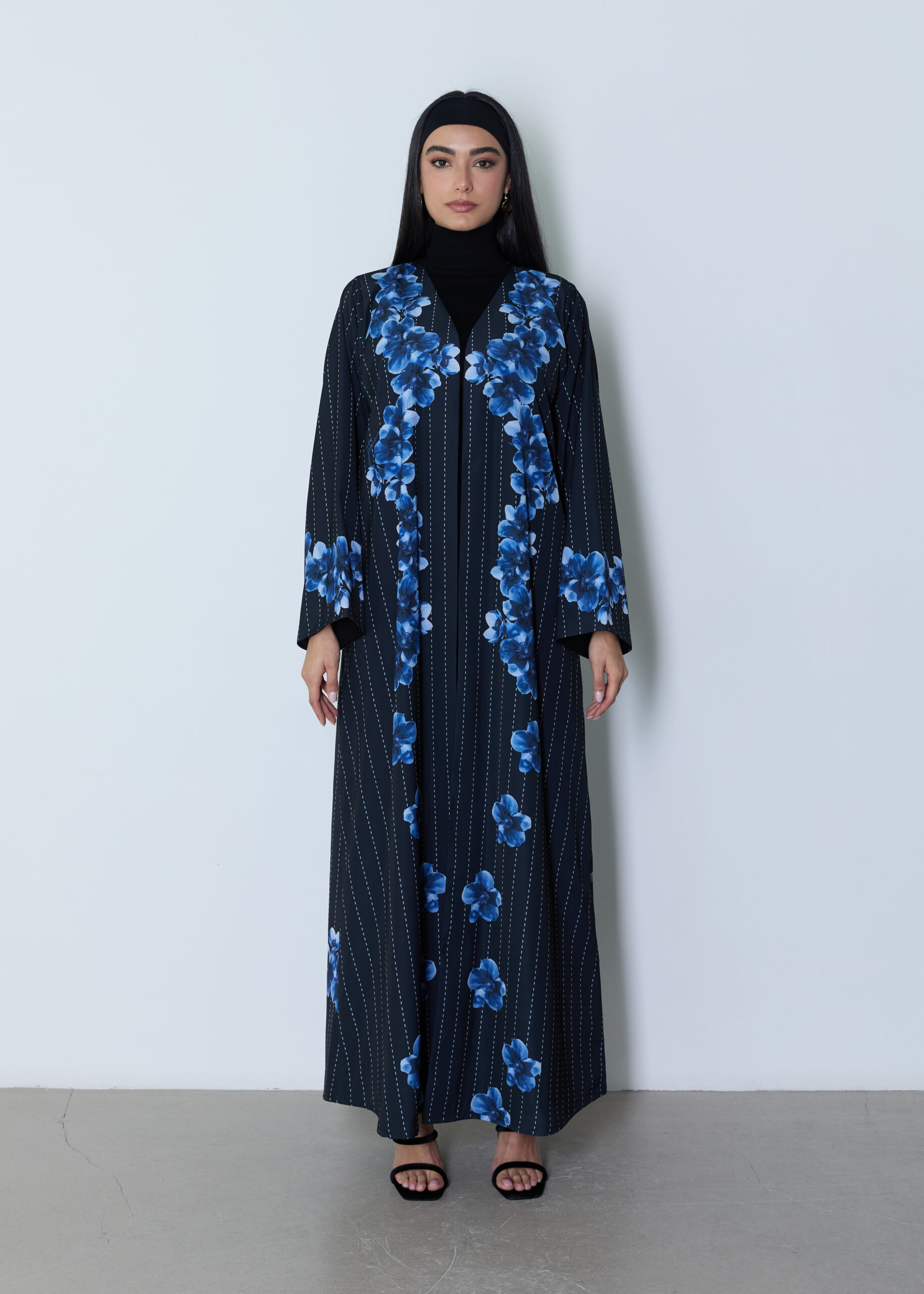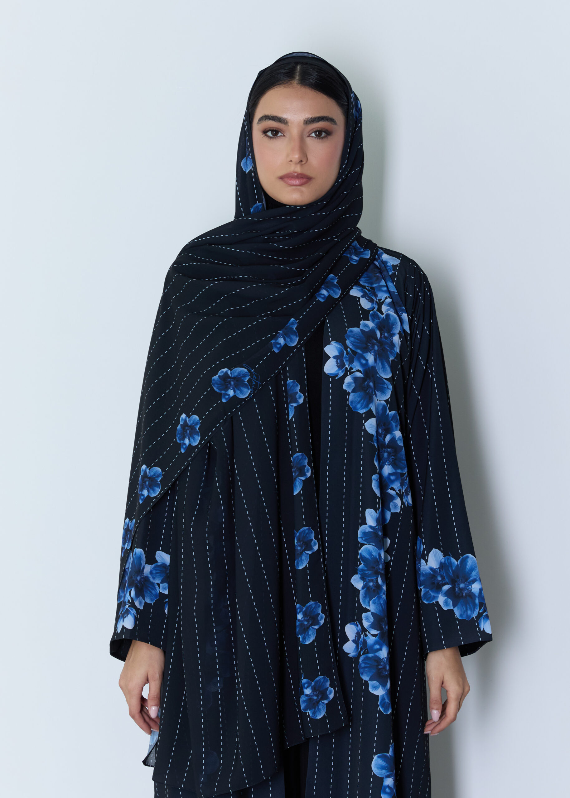 *A modern abaya featuring a distinctive artistic print exclusive to our brand, blending elegant blue and black tones for a striking visual depth. Crafted from soft crepe , it offers comfort and effortless wear with a feminine, relaxed silhouette.Paired with a matching sheila made from doja al lail fabric . A statement piece that combines contemporary elegance with practical sophistication—perfect for refined everyday styling.