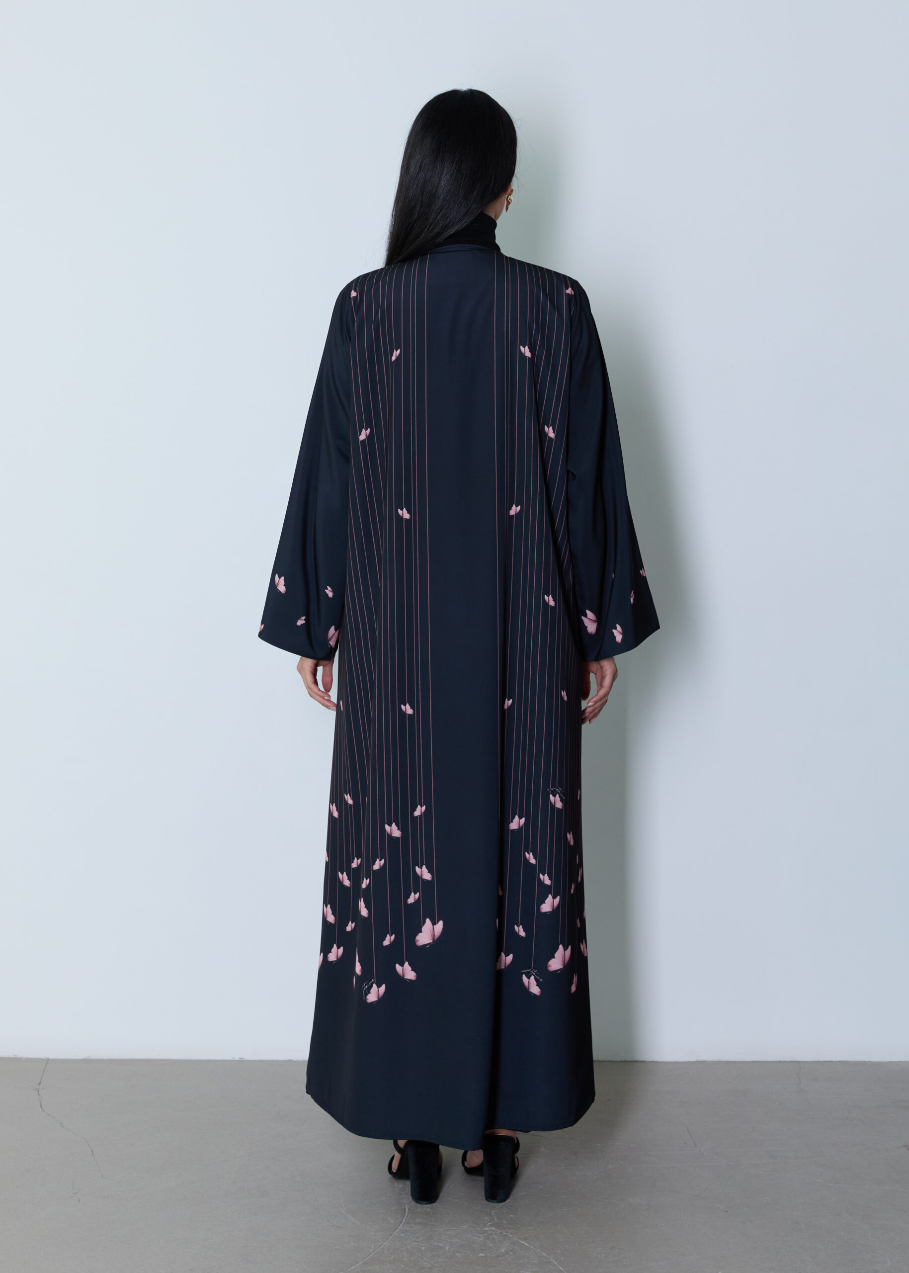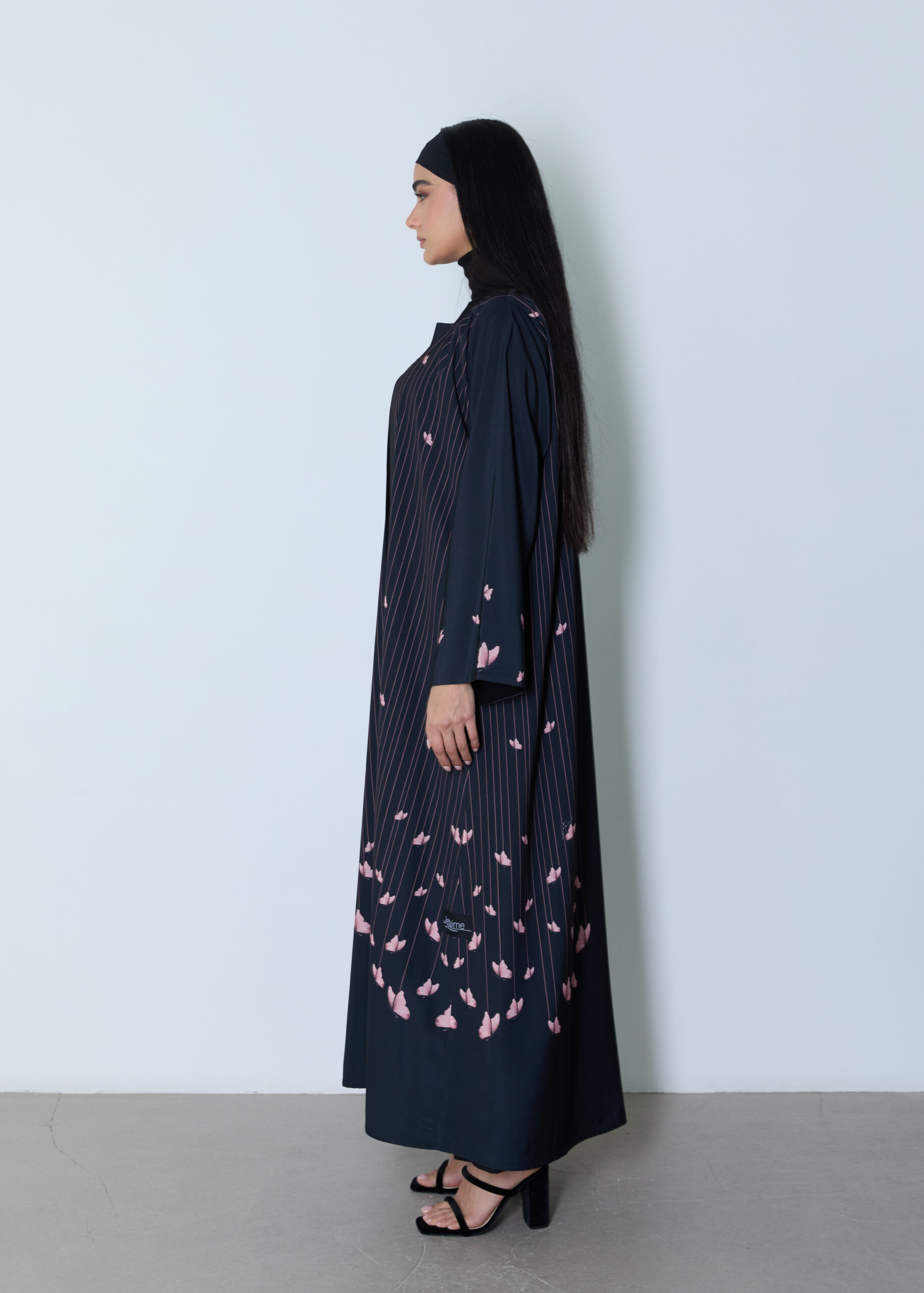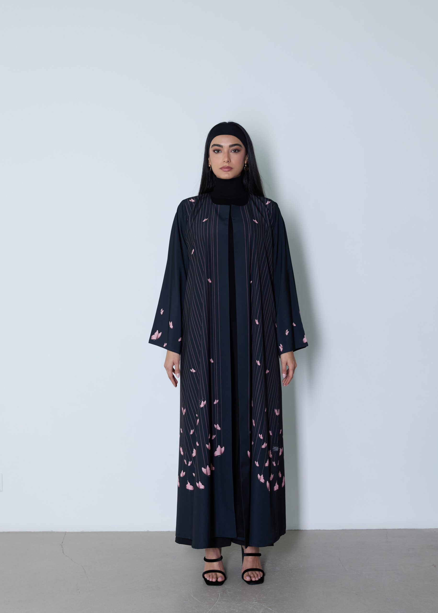 *An abaya crafted from soft crepe fabric, featuring a delicate pink butterfly design that adds a gentle feminine charm. Designed for comfort and fluid movement, it offers effortless wear with a soft, elegant silhouette. Paired with a matching sheila made from doja al lail fabric, featuring the same exclusive design, completing the look with refined harmony—perfect for graceful everyday elegance.