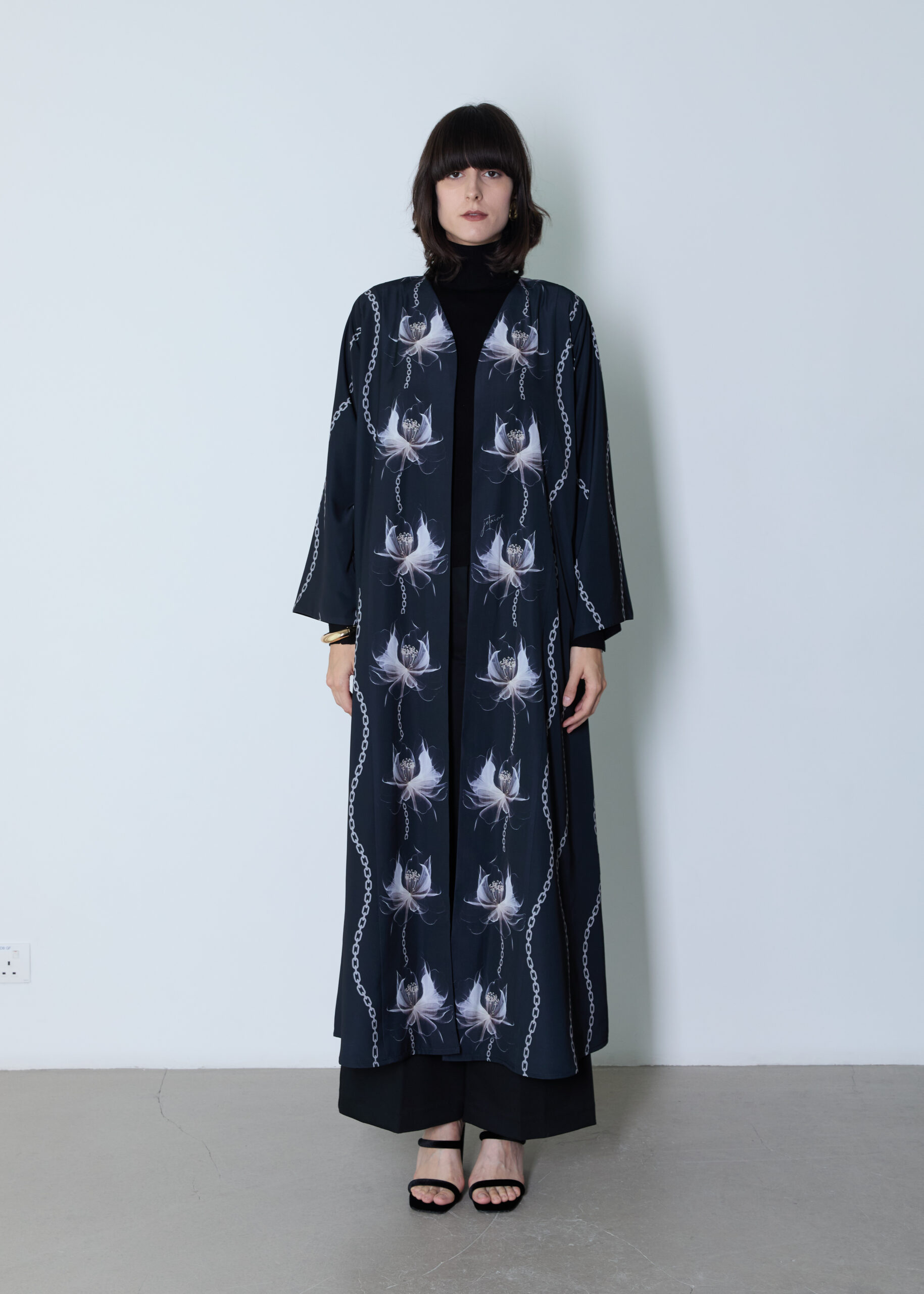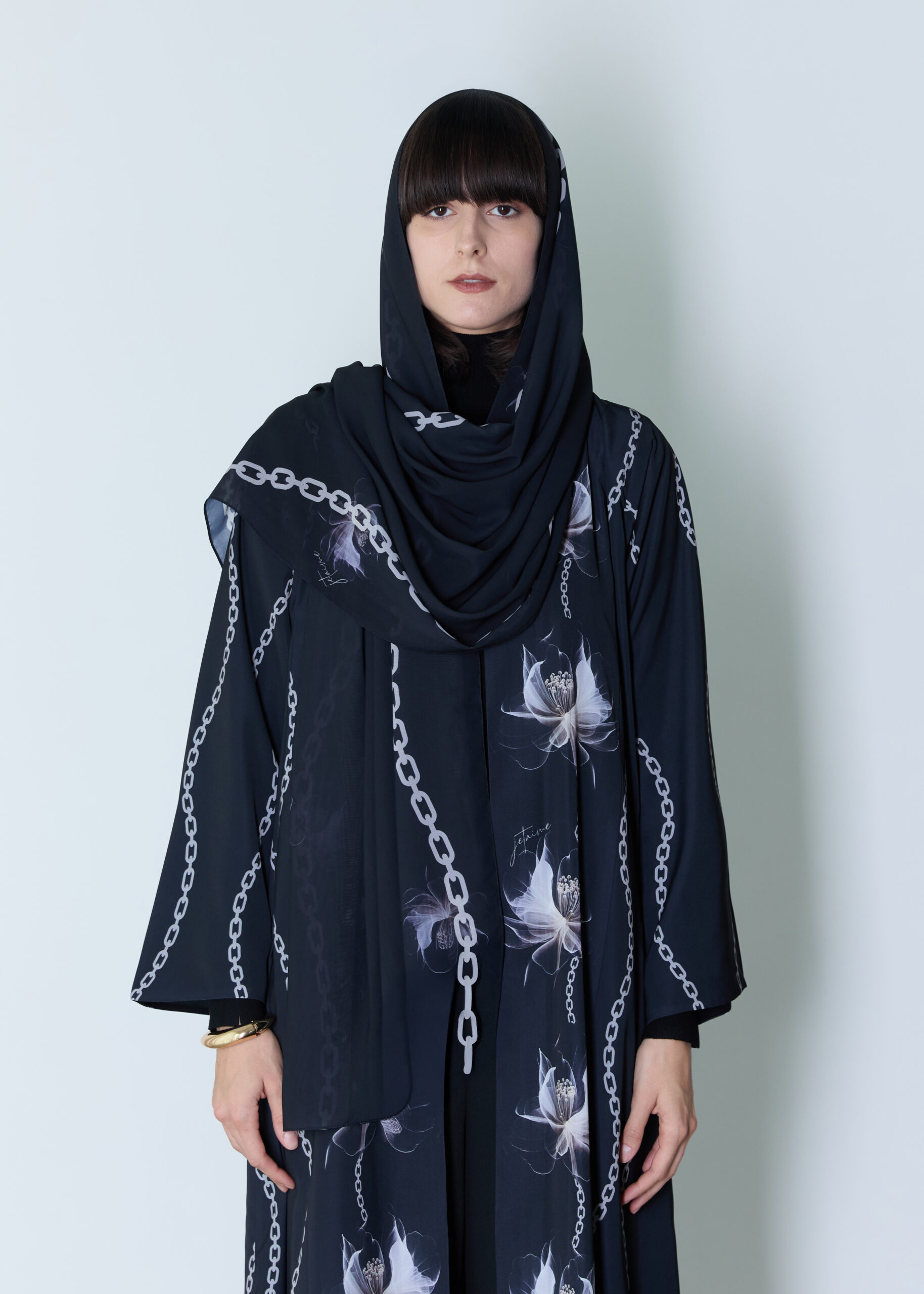 *An elegant abaya featuring a harmonious blend of soft floral prints and delicate chain motifs, creating a refined balance between femininity and modern sophistication. Crafted from soft crepe , offers comfort and effortless wear with a relaxed, feminine silhouette. Paired with a matching sheila made from doja al lail fabric, featuring the same exclusive design, completing the look with seamless harmony. A distinctive piece designed for everyday elegance, adding subtle character and polished charm to any look.
