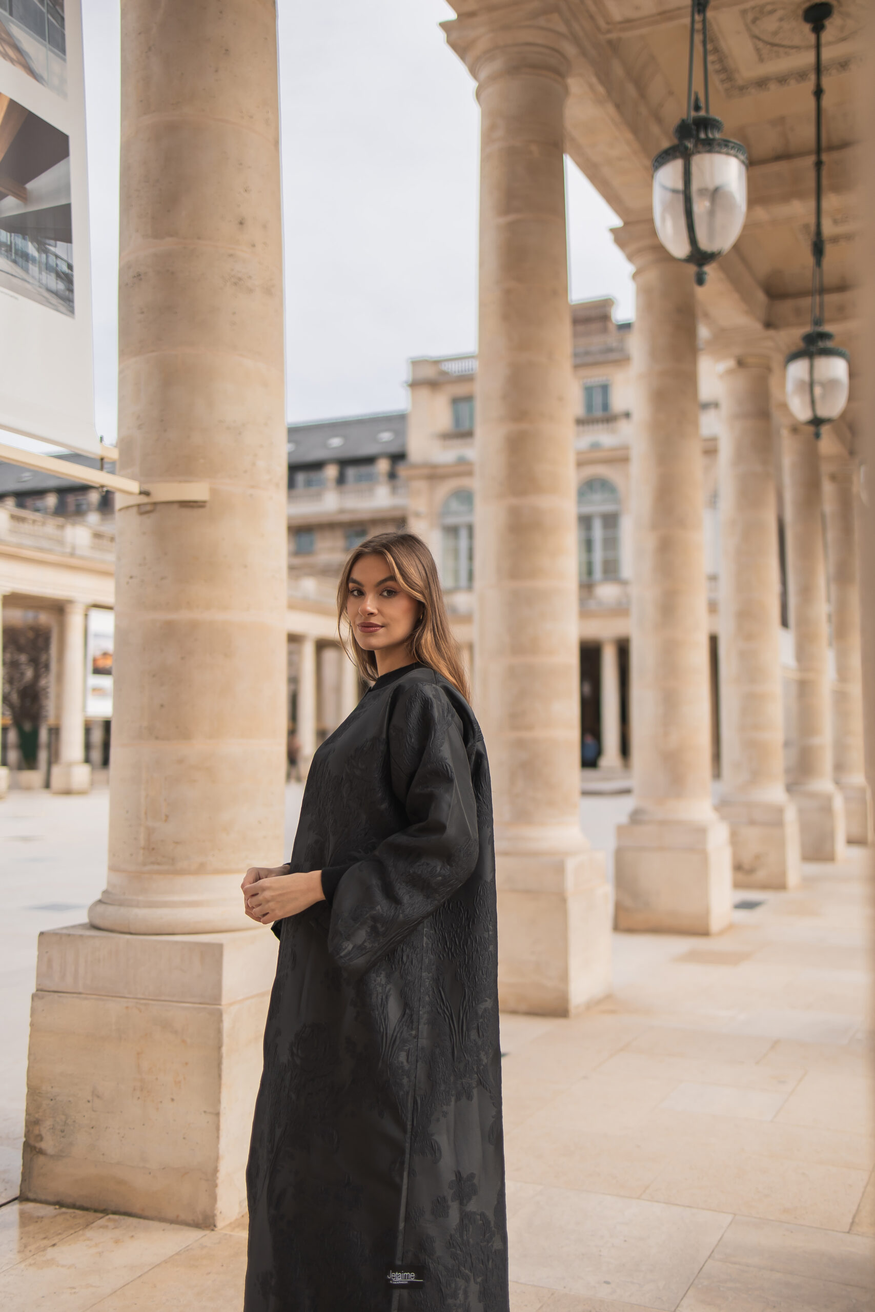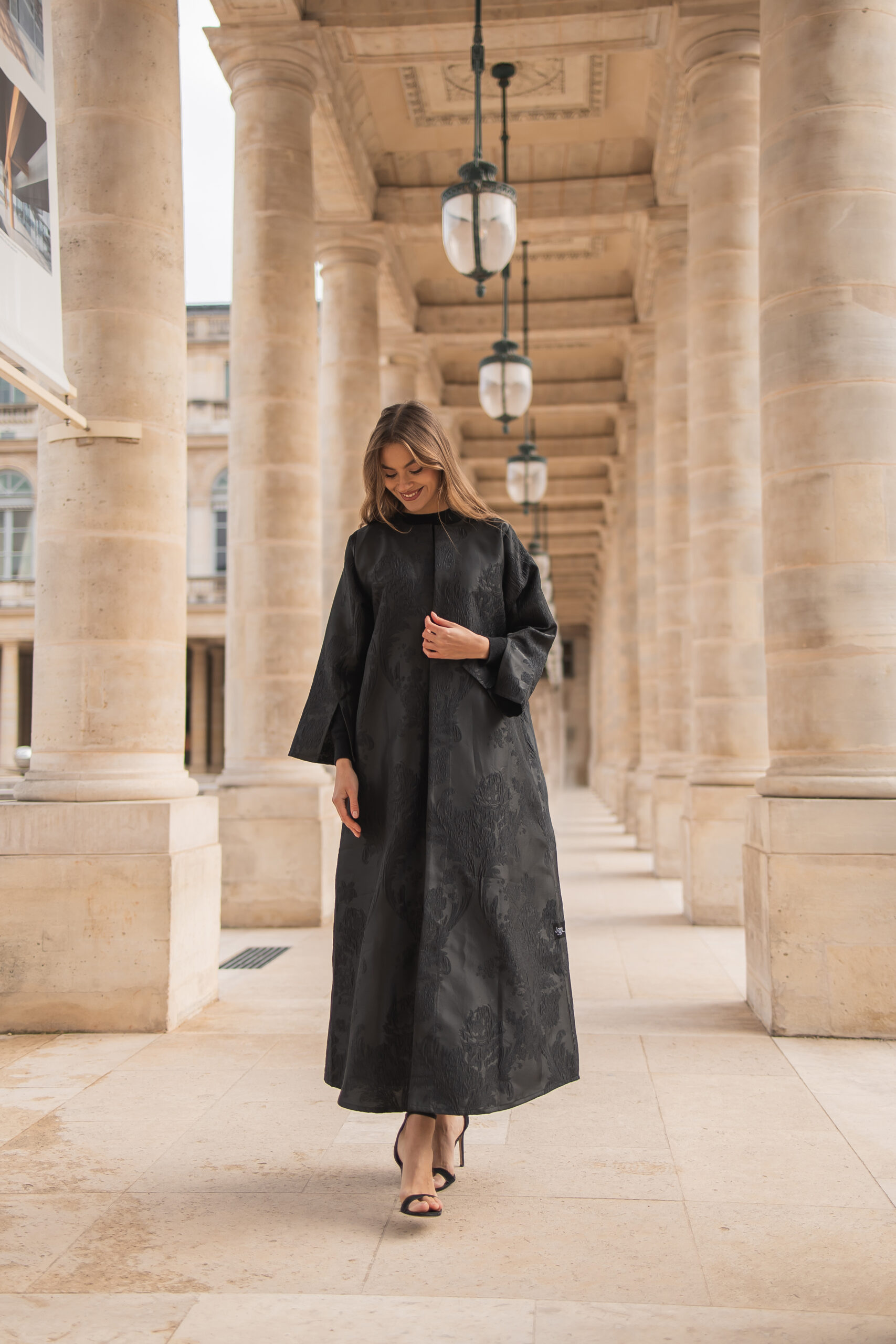 *luxurious black abaya crafted from premium high-end fabric, featuring refined textured details woven in the same black tone for a subtle, elegant effect. Designed with a graceful silhouette that flows effortlessly, it reflects timeless sophistication and quiet luxury. A statement piece that embodies understated elegance—perfect for refined daily wear and elevated occasions.